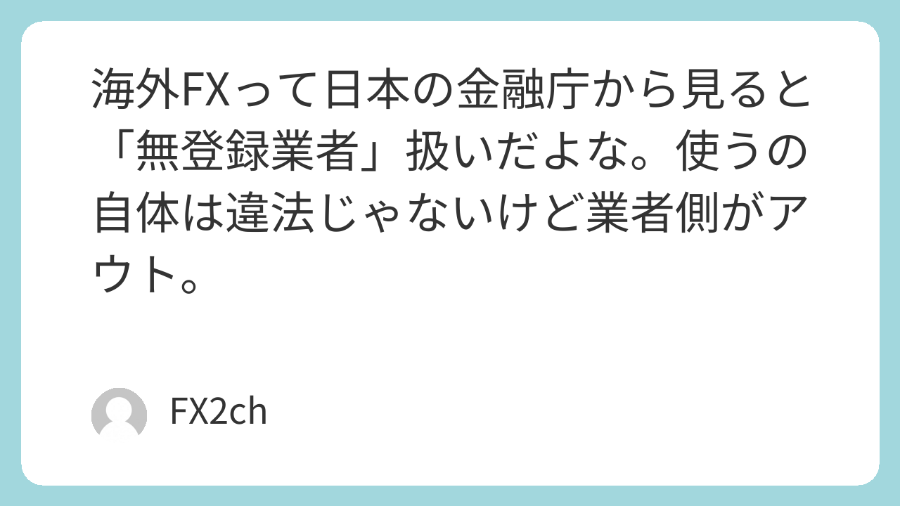 海外FXって日本の金融庁から見ると「無登録業者」扱いだよな。使うの自体は違法じゃないけど業者側がアウト。