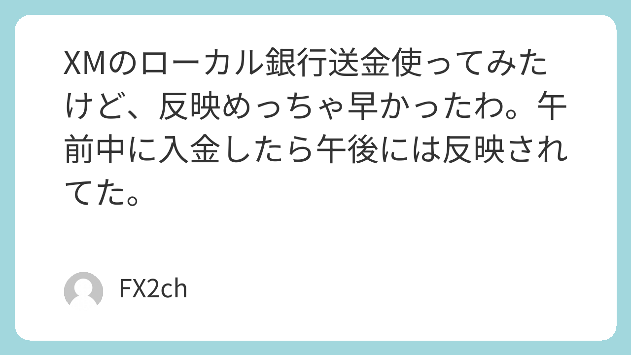 XMのローカル銀行送金使ってみたけど、反映めっちゃ早かったわ。午前中に入金したら午後には反映されてた。