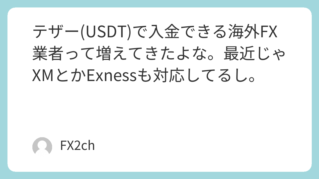 テザー(USDT)で入金できる海外FX業者って増えてきたよな。最近じゃXMとかExnessも対応してるし。