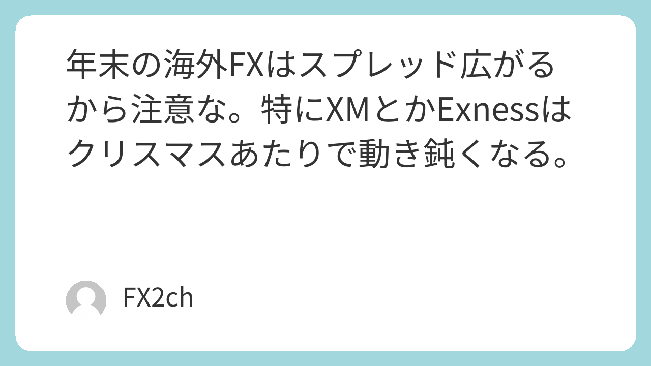 年末の海外FXはスプレッド広がるから注意な。特にXMとかExnessはクリスマスあたりで動き鈍くなる。