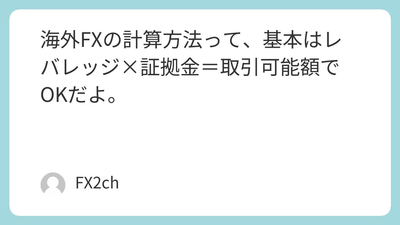 海外FXの計算方法って、基本はレバレッジ×証拠金=取引可能額でOKだよ。