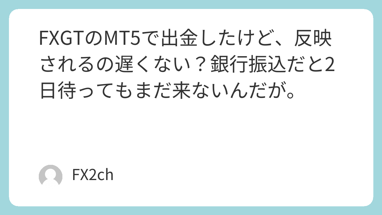 FXGTのMT5で出金したけど、反映されるの遅くない?銀行振込だと2日待ってもまだ来ないんだが。