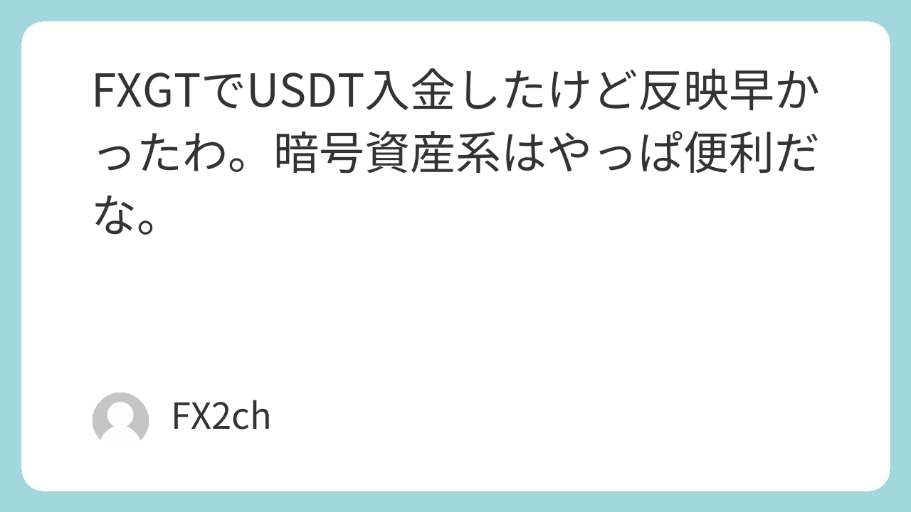 FXGTでUSDT入金したけど反映早かったわ。暗号資産系はやっぱ便利だな。
