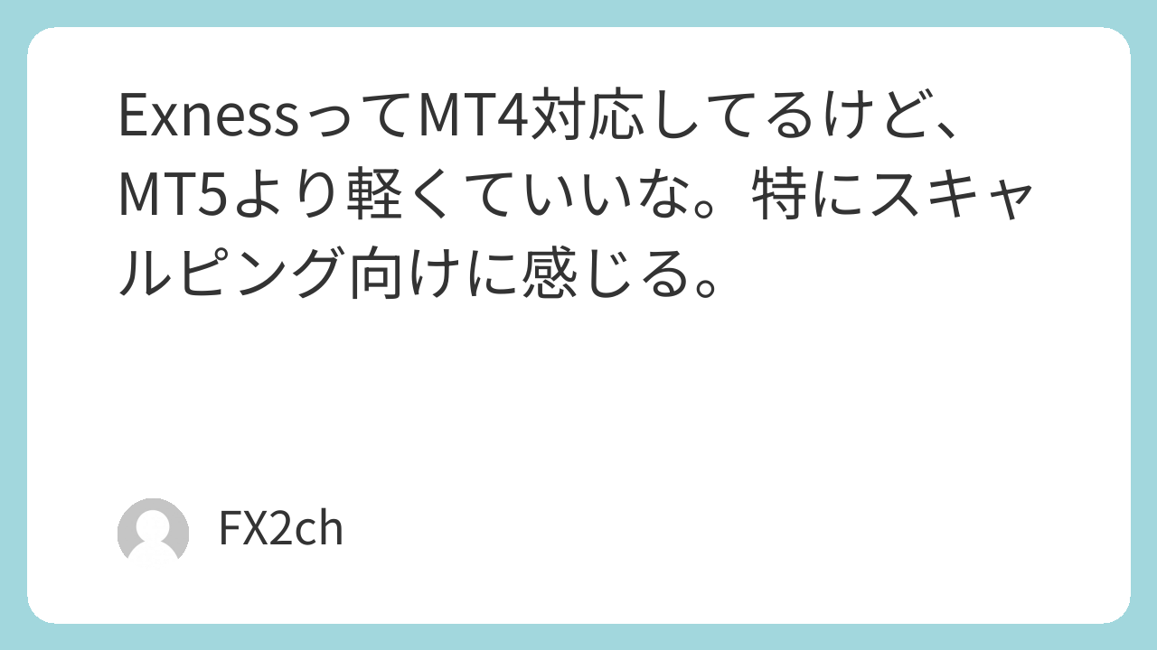ExnessってMT4対応してるけど、MT5より軽くていいな。特にスキャルピング向けに感じる。