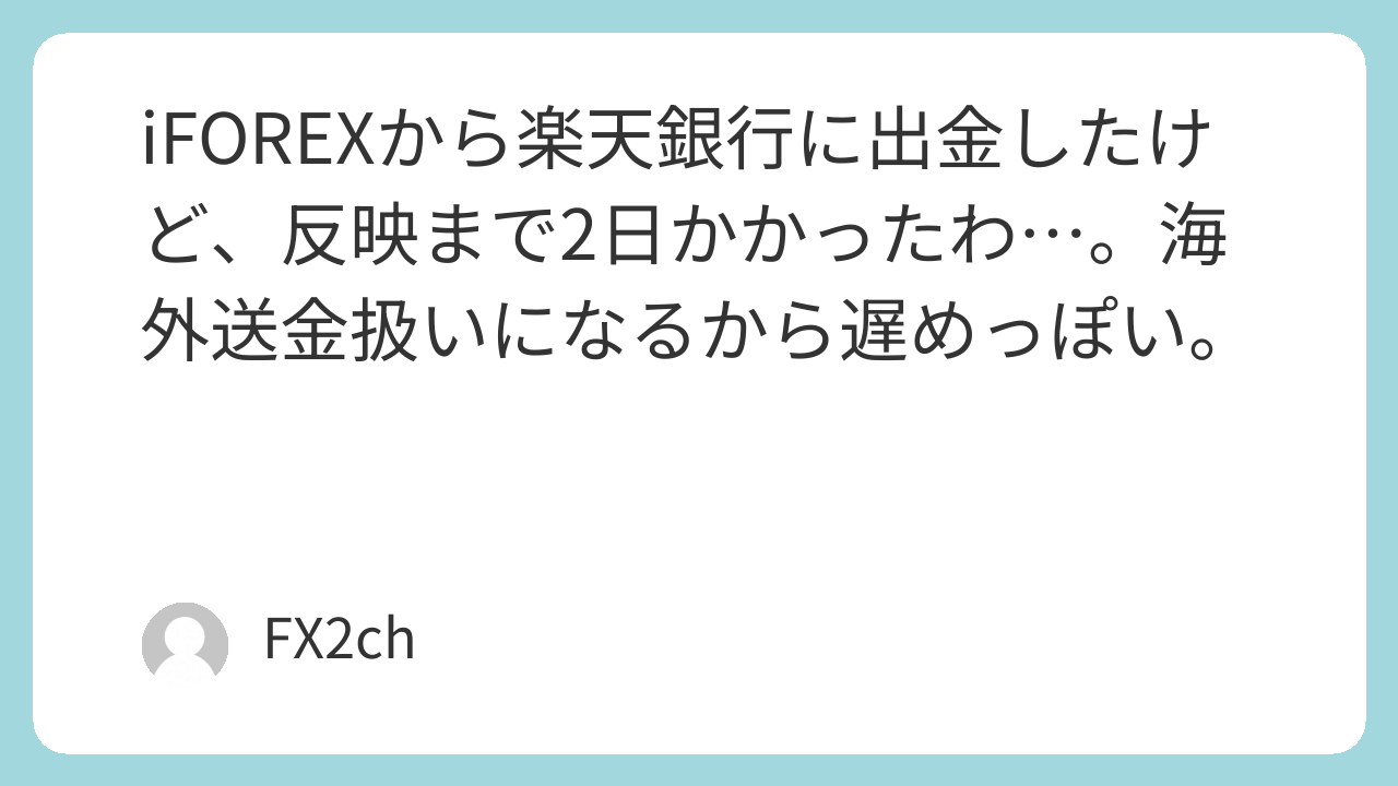 iFOREXから楽天銀行に出金したけど、反映まで2日かかったわ…。海外送金扱いになるから遅めっぽい。